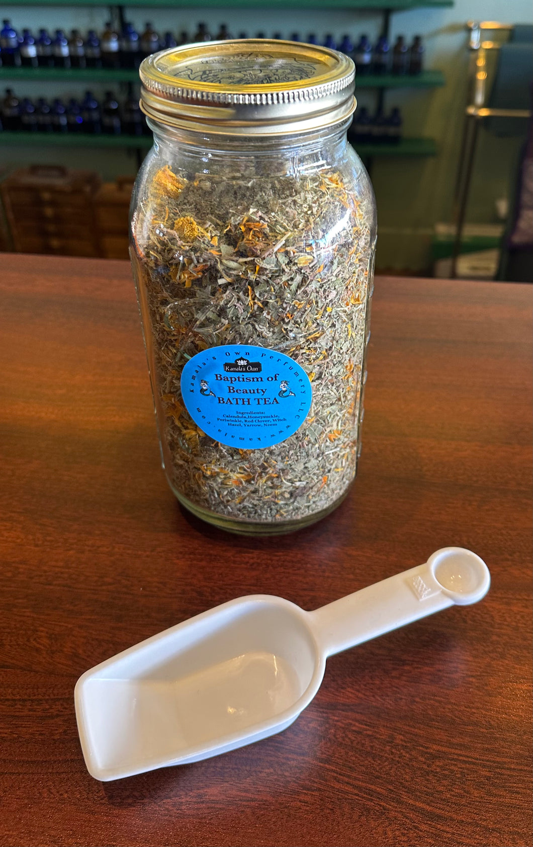 New for 2026, our bath teas are mixtures of herbs designed to both relax your mind and pamper your skin. To use a bath tea, remove the muslin bag from the plastic bag. You can either put the well sealed muslin bag directly in your hot bath water, or you can open the muslin bag and tie it around your faucet so the hot water runs through it into your tub. Either way, the herbs are extracted into your water to soothe and tone your skin.
