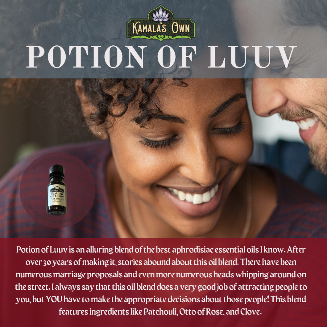 Potion of Luuv has been around for over 30 years now. It is an alluring blend of the best aphrodisiac essential oils I know of. At one point, it was called Love Potion, but apparently, somebody holds the patent on that name, so I decided that the name needed to reflect the way in which everybody seems to pronounce it. After 30 years, stories abound about this oil blend. There have been numerous marriage proposals and even more numerous heads whipping around on the street. I always say that this oil blend does a very good job of attracting people to you, but YOU have to make the appropriate decisions about those people! This blend features ingredients like Patchouli, Otto of Rose, and Clove.