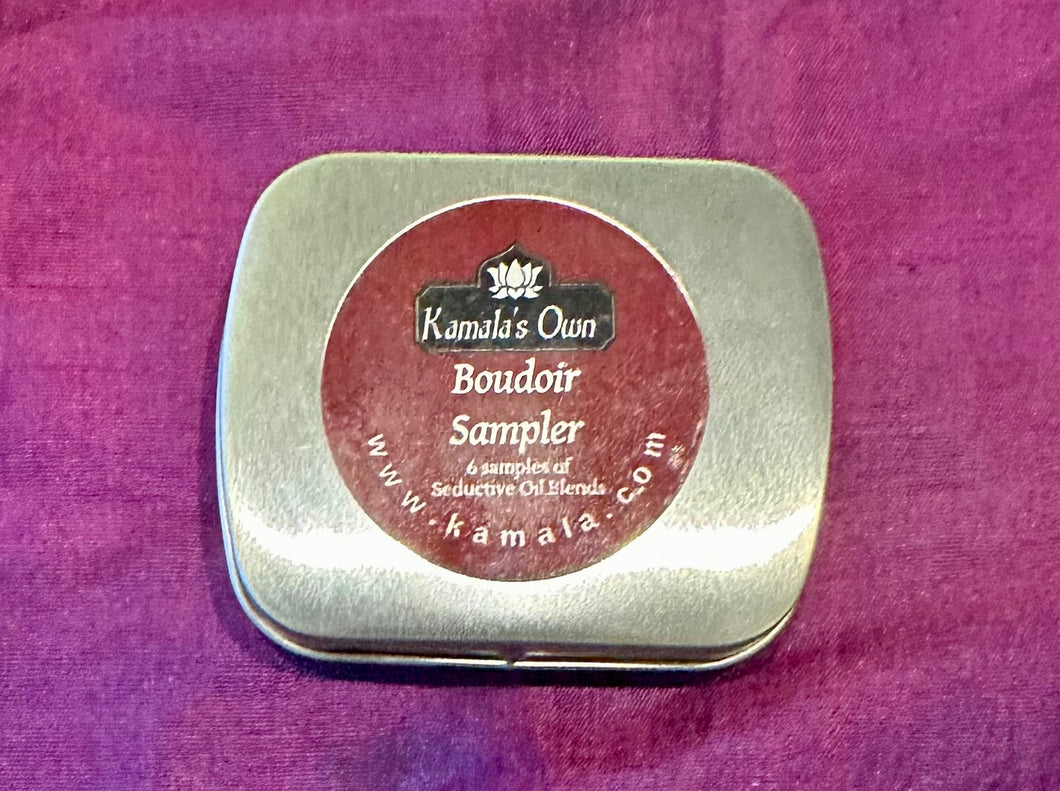 This is a small metal tin with six sample bottles inside (a sample is 1/32 oz.--very tiny). The six oil blends are: